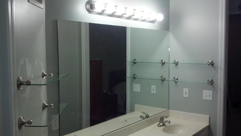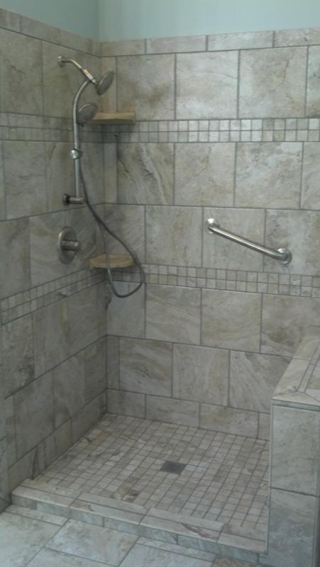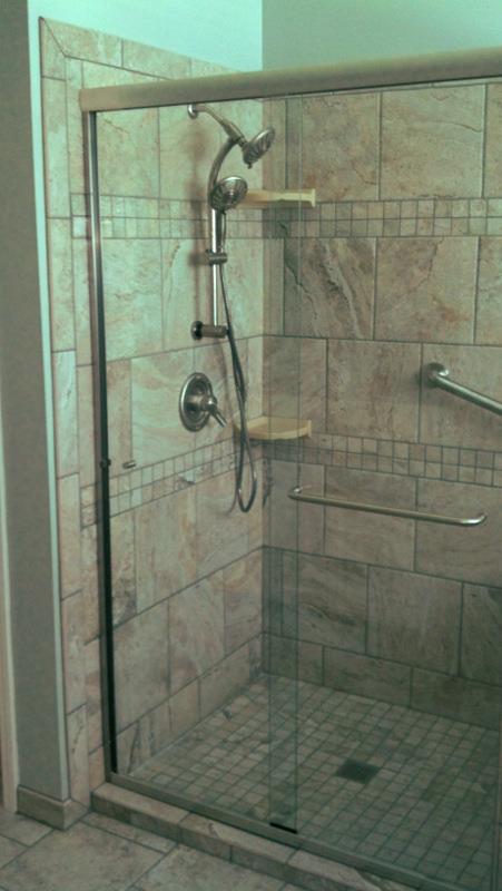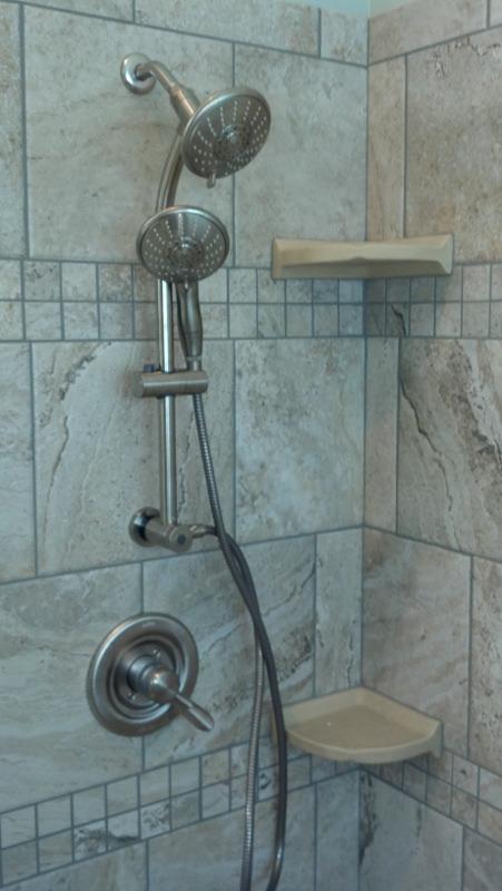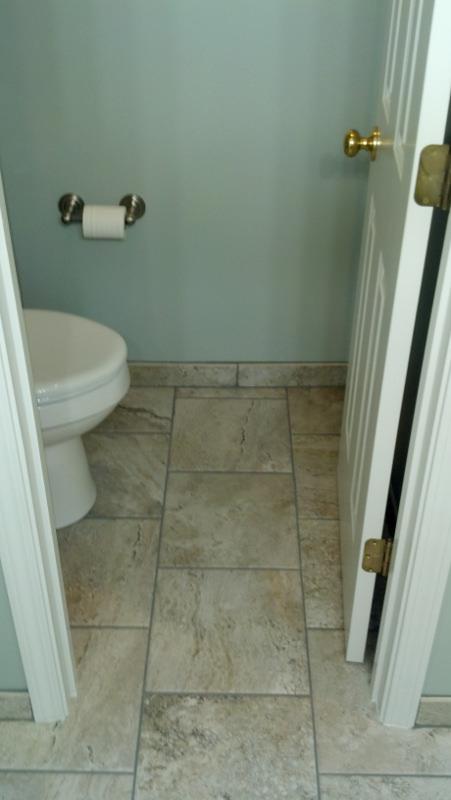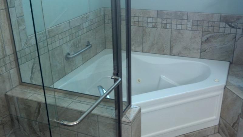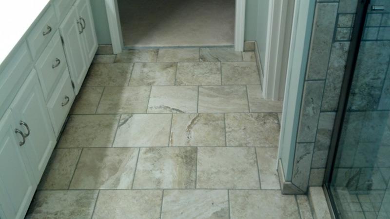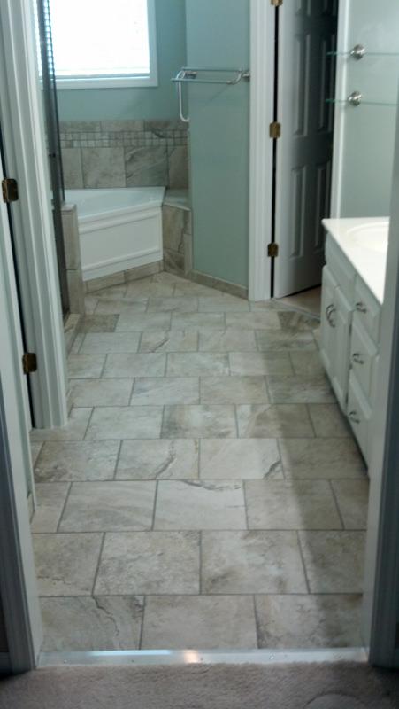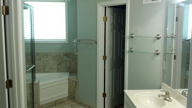 This bathroom originally had carpet, which is almost always a poor choice for a wet area. Fortunately moisture damage was minimal, however the old white 4×4 tile shower was subjected to mildew as most older showers are. The homeowner requested an electric heated flooring, which we were happy to provide in the main flooring area, in front of the toilet and in the shower pan itself. This Arko tile is brand new to our supplier, and the both the homeowner and we really liked how detailed and varied the pattern was. In this remodel, we repainted the entire room, repaired the water damaged framing and replaced all flooring and wall tile. We reused the existign whirlpool tub, vanity, vanity top, mirror and toilet. In addition, we added some glass shelving around the vanity for extra storage.
