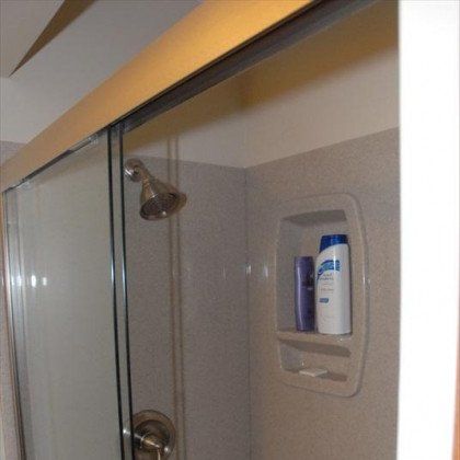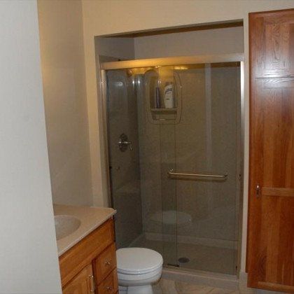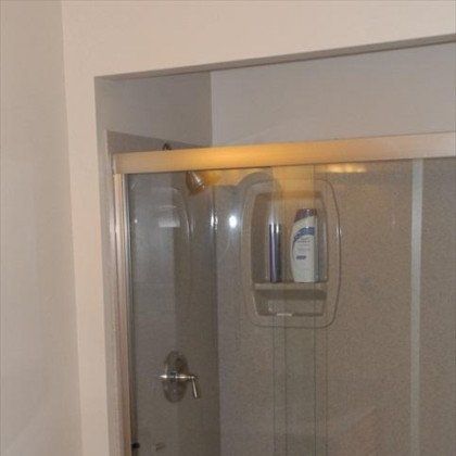This shower door was installed by Fountain Glass of Olathe, and while they acted as our subcontractor, we did not mark up their fee at all. We like to sub out this specialty trade, because they are fast and do wonderful work. Also, they offer a warranty and have all the equipment to transport and modify these doors without damaging them. This is the "semi-frameless" series, where the glass is 1/4" tempered glass, and it is also available with obscuring patterns for increased privacy. The homeowners opted for the clear door, which shows off the beauty of the Onyx system, and is easier to clean. We love this clean and modern look!