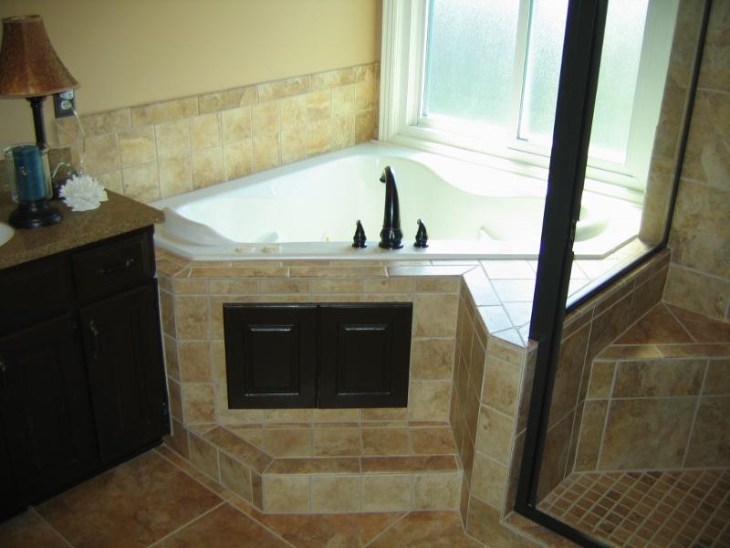 The whirlpool tub got a fixture upgrade, despite the horribly planned original placement that the homeowner did not want to go to the expense of moving. Typically, you're supposed to be able to sit on the edge of the tub and swing your legs over the edge, however the fixture clearly prevents that. As for the access panel to the motor and fixture, we opted to have some custom doors that matched the vanities crafted and painted to match. It ends up accenting the tile nicely.