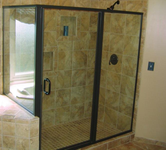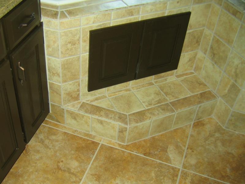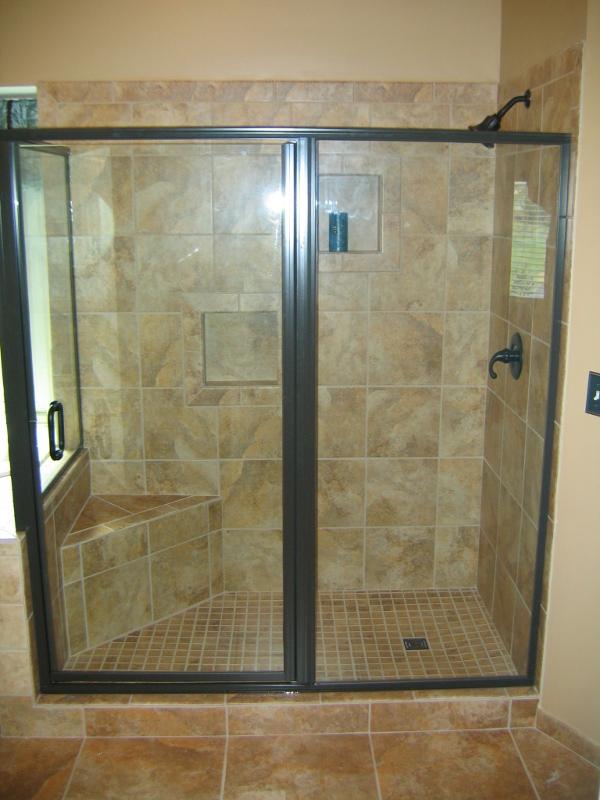 This project encorporated a complete retile of the existing bathroom. The price was greatly reduced, as the homeowner had performed their own demolition of the old shower, carpet and tile, which allowed us to get to work straight away. We installed a Wedi foamboard shower system, and used 3 varieties of the same series of Daltile SL83. The smaller the surface, the smaller the tile is a typical design concept that really adds some detail without adding a lot of cost on expensive decorative tile. As with most of our showers, we raised the shower head to about 6'6" from the standard 6′ height, and we set the two insets to create a downward flow from the showerhead to the seat in the back corner.