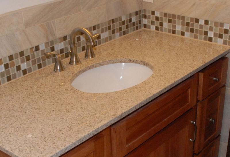This hall bathroom had outdated tile, an old scratched up vanity with cultured marble top and a dated Hollywood lighting system around the vanity. We went to work with the homeowner designing a new updated bathroom keeping a tile wainscot around the room and reusing the existing toiled. We replaced the old cast iron tub with a new, deeper Jetta acrylic soaker that holds heat better and allows for a more comfortable and relaxing bath. The tile is a Ragno porcelain tile with 1/16" spacing. This is a slight upcharge over normal spacing as the cuts have to be more precise, but the end result is a very clean look that impresses. The color selections on the tile and grout are neutral, so they go with any color of paint, but the detail in the tile print keeps neutrality from bleeding over into boring. As for the vanity, this is a Bridgewood vanity with no-clam doors and drawers, and the 2cm granite top finishes off the vanity nicely. The shampoo inset is a custom built insert for this job, and as always, all of our tile systems are waterproofed behind the tile to give a second layer of moisture protection.